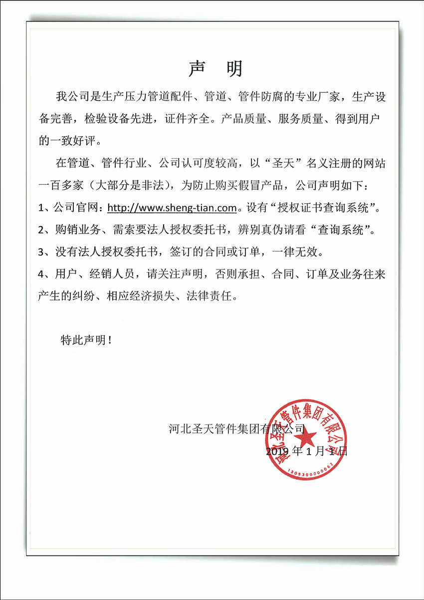 | 過去的一年,是河北圣天管件集團(tuán)有限公司飛速發(fā)展的一年,是河北圣天管件集團(tuán)有限公司的一年!這些成績(jī)讓我們清楚的知道社會(huì)各屆的支持是我們成長的營養(yǎng),顧客對(duì)我們的認(rèn)可是我們成長的土壤。 |